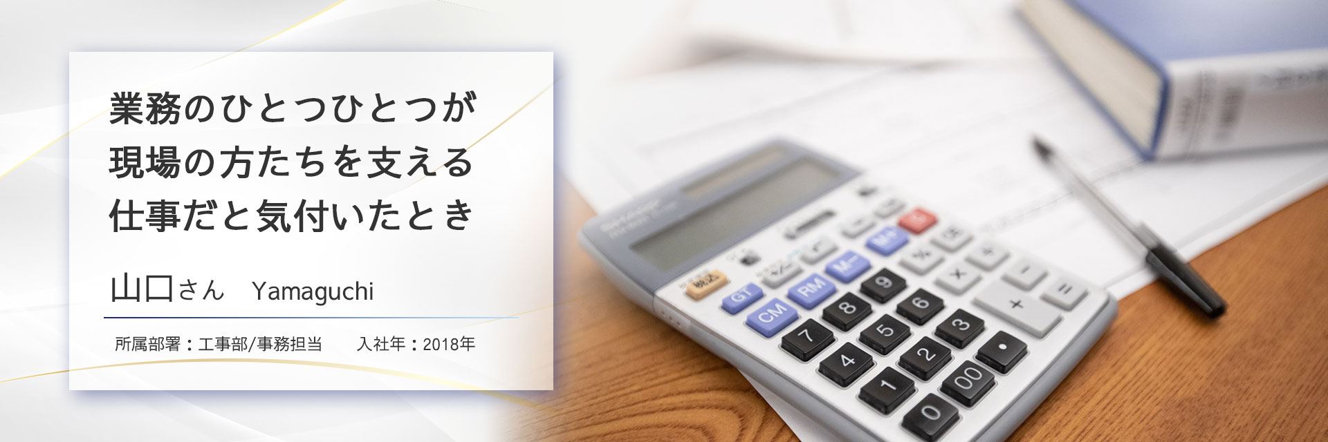 私は工事現場に直接関わりませんが私の業務のひとつひとつが現場の方たちを支える仕事だと気づいたことは、仕事を続けるうえで大きな発見でした。